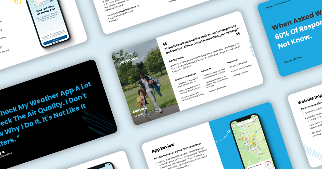 Improve the Love My Air mobile app experience, website and overall project messaging by employing quantitative and qualitative research methods to understand - engagement, usability, air quality knowledge, improvement suggestions and developer review.