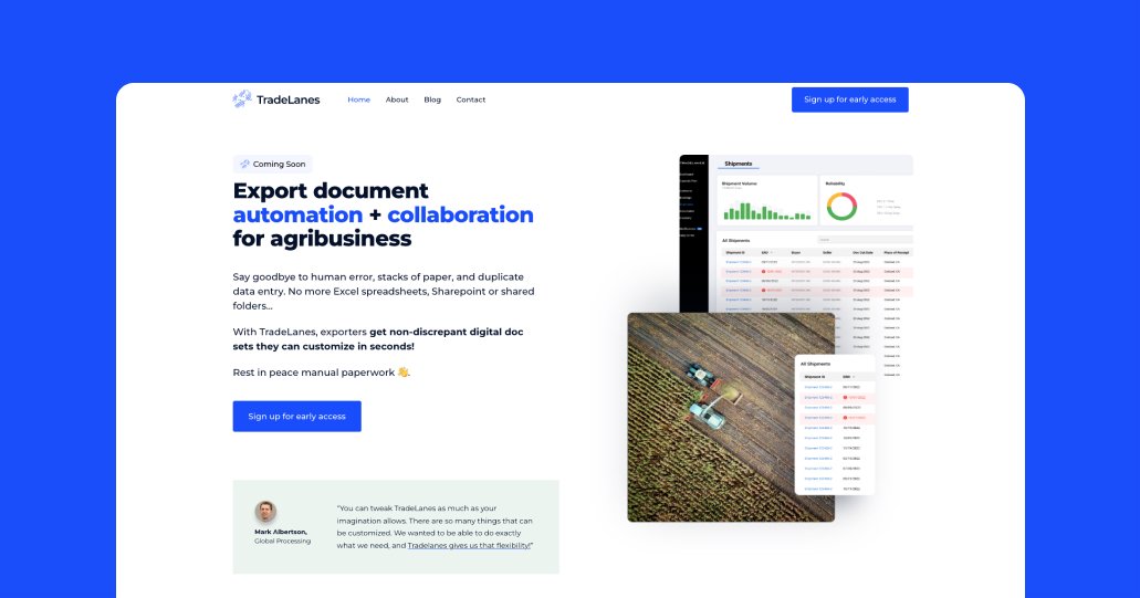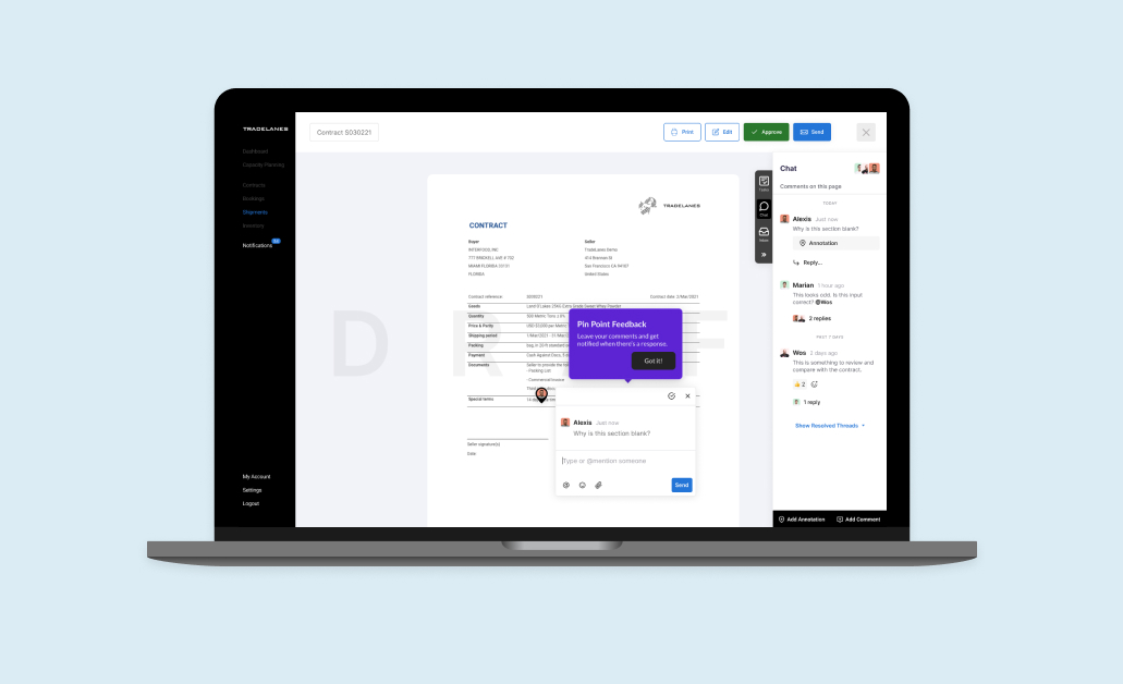 Tradelanes mission is to revolutionize the shipping industries data management needs. Whether you’re establishing a contract to buy or sell goods globally, or facilitating a portion of the process, Tradelanes offers a digitized, document export solution and communication platform for all parties including transportation partners and ports.