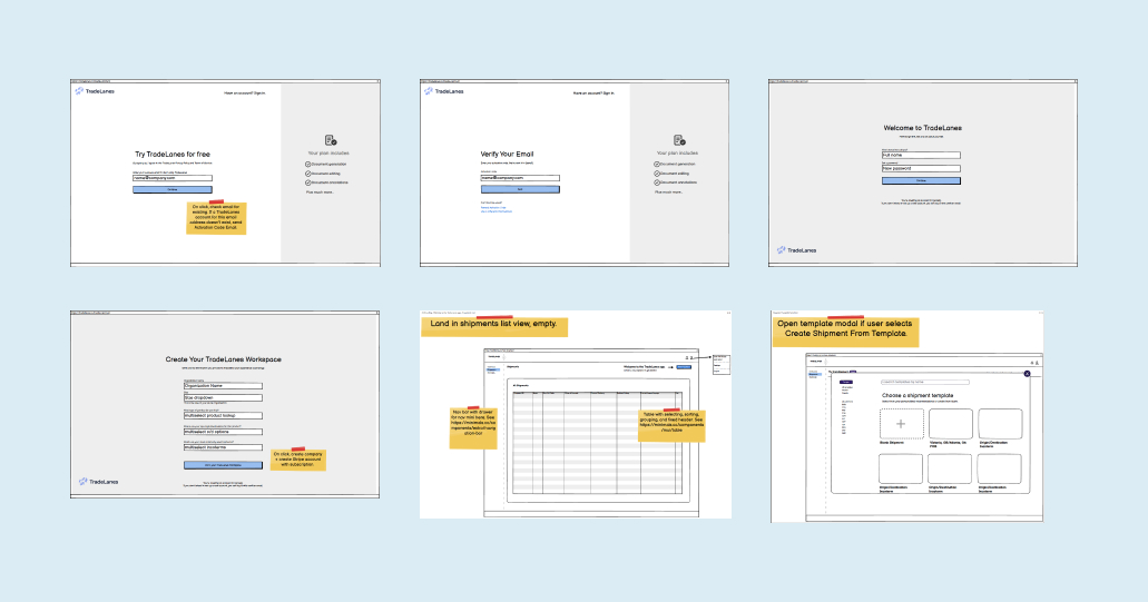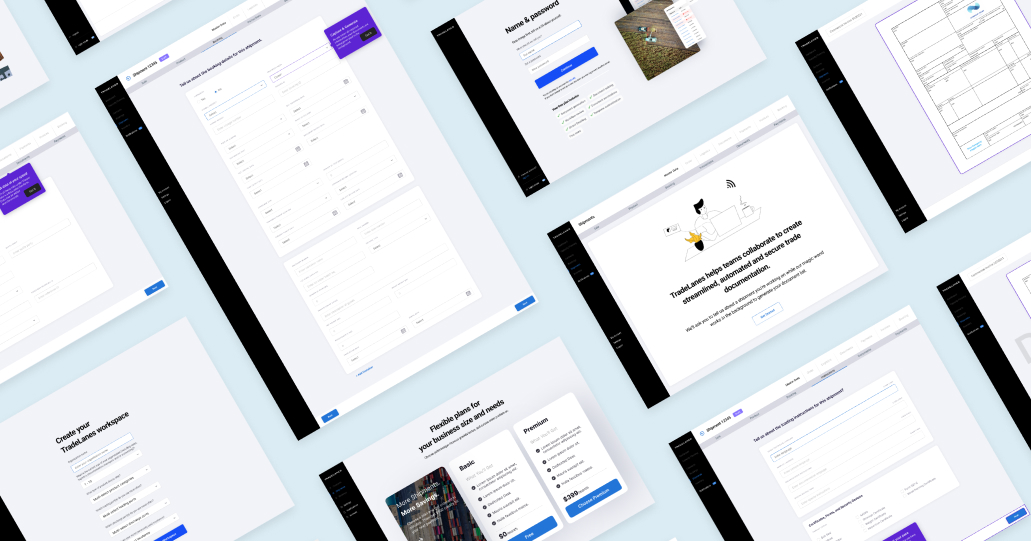 A lot of paperwork. Each stage required an extensive amount of data entry around buying and selling goods, quanity, weight, cost, goods transfer from manufacturer to port, port to port, taxes, required certificates, and so many other things crucial to successfully using the SaaS solution. Some portions of the experience require feedback between vendors whilst others have to generate the exact documentation needed to be submitted for processing. We also needed a solution that helped users have a faster first time to value experience.